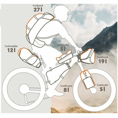 Utilisez le sac à dos Trailpack seul en ville ou pour une journée de VTT. Mais combinez sa puissance de rangement avec les autres sacs vélo bikepacking de Vaude lorsque vous partez quelques jours en vélo sur chemins ou en cyclotourisme. Les images 5 et 6 montrent un exemple de chargement vélo pour le bikepacking.