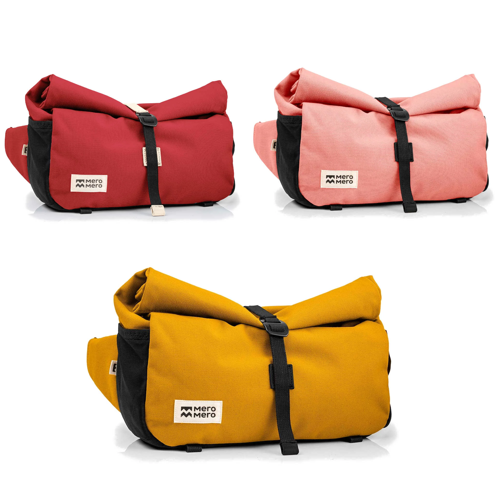La banane Piha peut accueillir un grand nombre d’affaires. Elle possède un volume de 3 litres lorsqu’elle est fermée compressée ; il peut aller jusqu’à 6 litres lorsque la sacoche est déroulée. La sacoche Mero Mero possède une fermeture par aimant puis par enroulement “roll top” avec crochet qui sert à adapter la taille de votre sacoche au volume d’affaires à emporter. Cette fermeture par le haut a également l’avantage de vous permettre d’accéder facilement à vos affaires lorsque vous êtes à vélo. Ainsi, pas besoin de descendre du vélo, il vous suffit simplement de dérouler la fermeture.