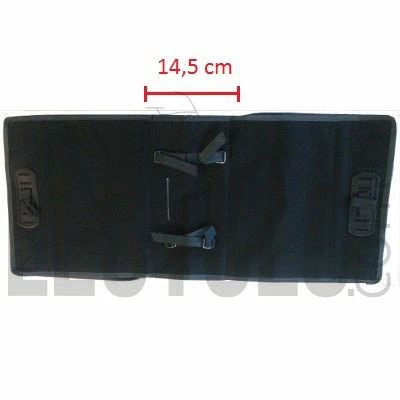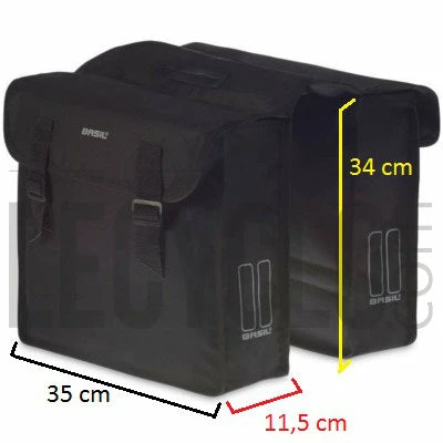 Les sacoches Mara de la marque Basil mesurent chacune 35 x 11,5 x 34 cm pour une capacité totale de 26 L au total. Elles s’installent de part et d’autre du porte-bagages arrière grâce à des sangles à boucles en haut et des bandes velcro en bas. Des ouvertures au niveau de la bande reliant les sacoches entre elles permettent d’y glisser des tendeurs pour fixer des chargements sur le porte-bagages si besoin. Elles possèdent également un fond en dur pour les maintenir en place